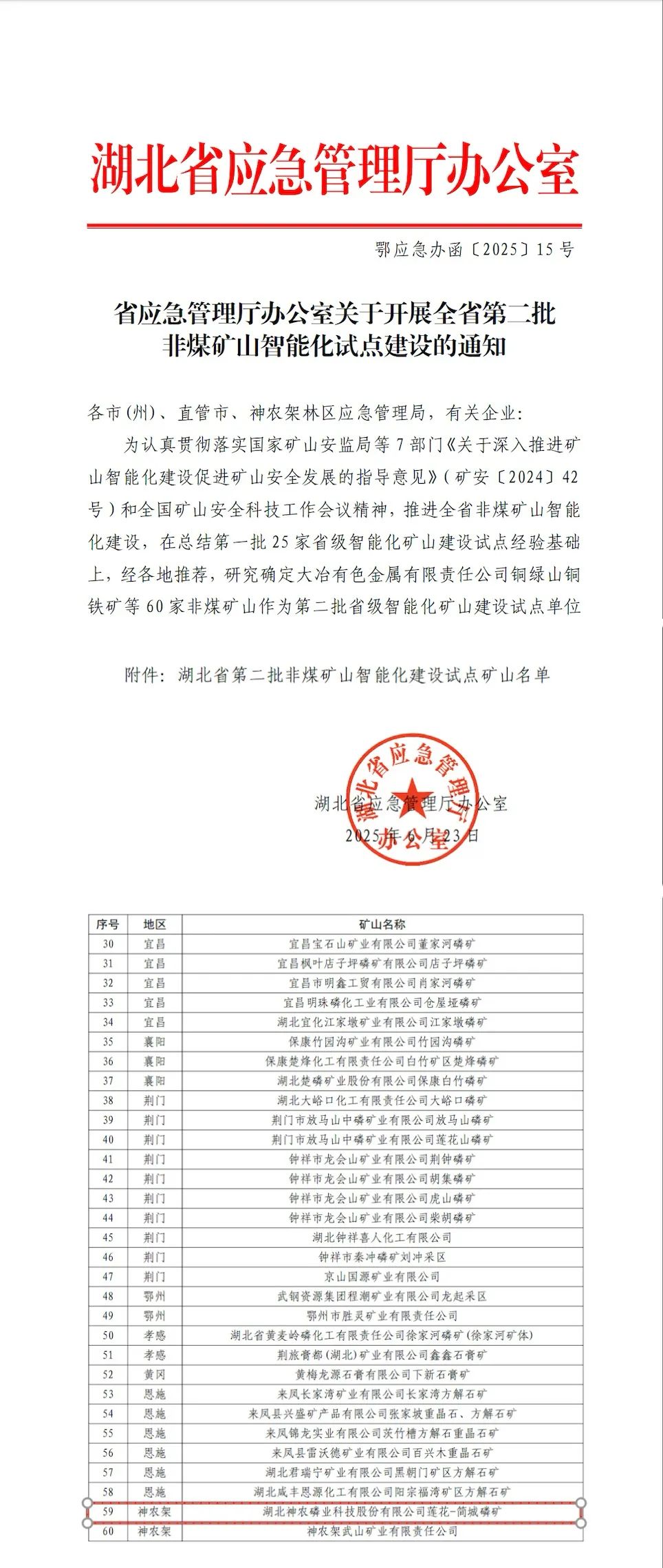 聯(lián)投礦業(yè)蓮簡磷礦入選湖北省第二批非煤礦山智能化試點(diǎn)建設(shè)名單